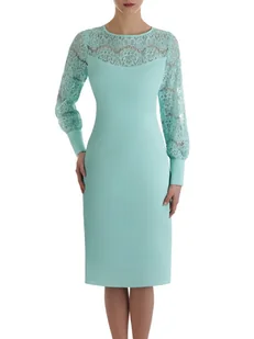 Miętowa sukienka z dekoracyjnym, koronkowym karczkiem to esencja świeżości i stylu w jednym. Jej długi rękaw dodaje elegancji, jednocześnie sprawiając, że sukienka jest doskonała na różne okazje, zarówno te formalne, jak i bardziej casualowe. Kolor miętowy to odzwierciedlenie delikatności i uroku, dodając całości subtelnego piękna. Prosty fason sukienki podkreśla klasyczny design, jednocześnie zapewniając wygodę noszenia. Koronkowy karczek, pełen detali, nadaje kreacji niezwykłego charakteru, tworząc efektowny kontrast z jednolitym kolorem sukienki.