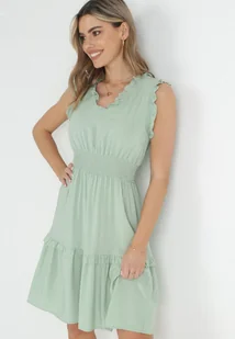 Miętowa Sukienka z Falbankami i Marszczoną Gumką w Pasie z Wiskozy Falirina - Born2be
