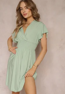 Sukienka Jadith z kopertowym dekoltem. Fason z szeroką, marszczoną gumką w pasie o długości mini. Zwiewny, krótki rękawek. Wykonana z wiskozy. Gładki wzór.