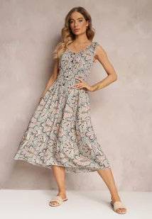 Kwiecista sukienka Jallia o rozkloszowanym fasonie i długości midi. Model na szerokich ramiączkach z ozdobnymi guzikami do wysokości talii oraz falbanką na dole. Bez podszewki. W pasie wszyte cienkie gumki rozciągające się na wymiar 95 cm (S/M) i 99 cm (L/XL).