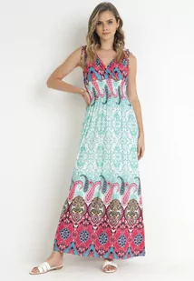Miętowo-Różowa Sukienka z Szeroką Gumką w Talii w Etno Wzór Caroli