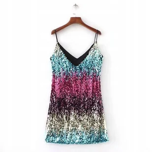 Damska sukienka, mini z kolorowymi cekinami. Model: S-66 Wykonany z materiału: 78% Poliester 22% Rayon (wiskoza) Długość (licząc od ramiączek) 86 cm Długość ...