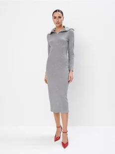Dzianinowa sukienka o dopasowanym kroju i długości midi. Posiada wysoki kołnierz z zamkiem.