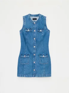 Jeansowa sukienka o długości mini, z guzikami. Posiada patki kieszeniowe oraz dwie kieszenie.