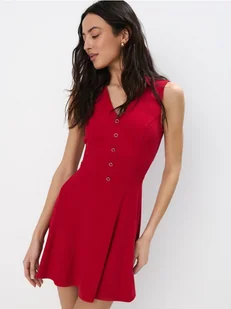 Sukienka o długości mini, na szerokich ramiączkach. Posiada dekolt w kształcie V i ozdobne guziki z przodu.