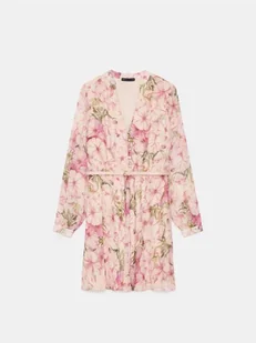 Sukienka o kroju litery A i długości mini, z paskiem. Posiada dekolt V, ozdobne guziki z przodu i długie rękawy zakończone mankietem.