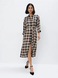 Wiskozowa sukienka o koszulowym kroju i długości midi. Posiada wiązanie w talii, zapięcie na guziki oraz modny wzór w kratę.
