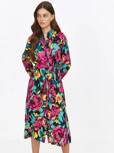 Sukienka damska Top Secret koszulowa o luźnym kroju. Ujmująca swym niebagatelnym stylem koszulowa sukienka damska o długości za kolano z prostym długim rękawem, zakończonym mankietem z zapięciem na guzik. Posiada ona klasyczny kołnierzyk i jest zapinana na całej długości przodu na guziki, a w talii ma efektowną szarfę z tego samego materiału do jej przewiązywania, która podkreśla smukłość kobiecej sylwetki. Wykonana ona została z miłej w dotyku dzianiny, będąc wzbogaconą o barwny nadruk z motywem ręcznie malowanych kwiatów. Może być ona z powodzeniem wykorzystywana zarówno jako element stroju do pracy, jak i też na co dzień.