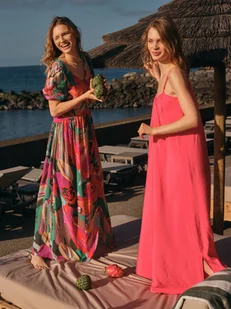 Sukienka damska Top Secret z efektownymi bufiastymi krótkimi rękawami. Ceniona za swój niecodzienny styl oraz duży komfort podczas użytkowania, długa sukienka damska o pełnym luzu i swobody kroju z efektownym rozkloszowaniem oraz ciekawym rozporkiem z przodu u dołu. Posiada ona dekolt w serek wraz z ozdobną lamówką wokół oraz krótkie bufiaste rękawy zakończone luźną gumką. Wykonana ona została delikatnej oraz przyjemnej w dotyku dzianiny, wzbogaconej o nadruk na całości z motywem ręcznie malowanej roślinności, a uroku dodaje jej odcięcie w talii podkreślając