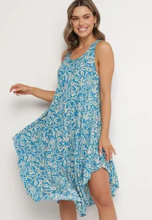 Niebieska Asymetryczna Sukienka Bawełniana w Ornamentalny Wzór Natialira