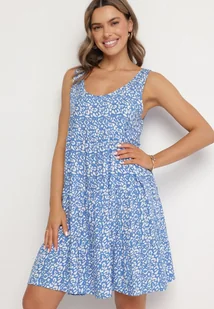 Niebieska Bawełniana Sukienka o Rozkloszowanym Kroju z Geometrycznym Wzorem Natiriana