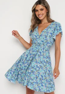 Niebieska Bawełniana Sukienka z Gumką w Talii i Dekoltem w Serek o Kwiatowym Wzorze Doradea