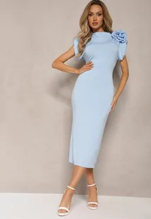 Niebieska Dopasowana Sukienka Midi z Kwiatkiem w Postaci Broszki Olivetta