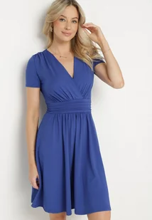Niebieska Rozkloszowana Sukienka z Wiskozą o Kopertowym Kroju z Marszczeniem Adivas