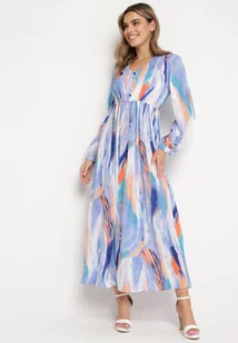 Niebieska Sukienka Maxi z Gumką w Pasie w Abstrakcyjny Wzór Taniera