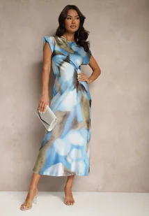 Niebieska Rozkloszowana Sukienka w Abstrakcyjny Print z Ozdobnym Marszczeniem Tillanara