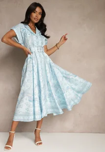 Niebieska Rozkloszowana Sukienka Koszulowa z Lnu i Wiskozy z Paskiem Alumera