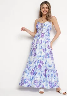 Niebieska Sukienka z Wiskozy i Bawełny Rozkloszowana w Kwiatowy Print z Ozdobnym Wiązaniem Wiama