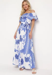 Niebiesko-Biała Sukienka Typu Hiszpanka z Gumką w Pasie i Materiałowym Paskiem Ozdobiona Falbanką Woneri
