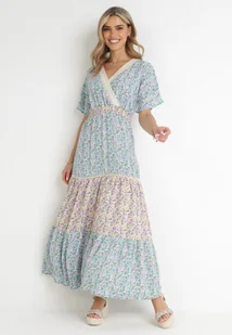 Rozkloszowana sukienka Gerbera z kwiecistej tkaniny. Model o długości maxi i kopertowym fasonie. W pasie marszczona gumka, która po rozciągnięciu ma wymiary: 85 cm (S/M), 89 cm (L/M), 93 cm (L/XL). Koronkowa taśma przy dekolcie i na dole sukienki.