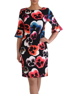 Wprowadź wiosenną świeżość do swojej garderoby dzięki tej wiosennej sukience z kwiatowym, wielobarwnym nadrukiem na czarnym tle. Sukienka o prostym fasonie, z dominującym wzorem kwiatów, zachwyca indywidualnym układem nadruku w zależności od rozmiaru. Ozdobne rękawy 3/4 z rozcięciami oraz dekolt w łódkę dodają jej subtelnego uroku. Sukienka sięga do kolan, a rozcięcia na bokach i rękawach nadają jej lekkości i wyjątkowego charakteru. Wybierz tę kolorową sukienkę, aby dodać energii i radości do swoich wiosennych stylizacji!