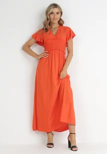 Pomarańczowa Kopertowa Sukienka z Wiskozy z Gumką w Pasie Neroni