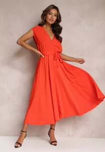 Pomarańczowa Rozkloszowana Sukienka Maxi z Kopertowym Dekoltem i Wiązanym Paskiem Hallona