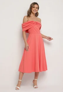 Pomarańczowa Rozkloszowana Sukienka z Odsłoniętymi Ramionami i Drapowaniem Odilene