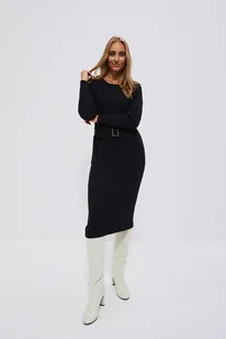 70%WISKOZA, 30%POLIAMID. Czarna sukienka midi z paskiem. Okrągły dekolt. Na całości widoczny prążek.
