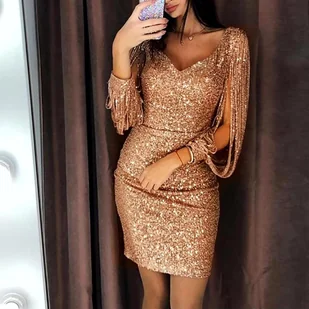 Prosta imprezowa brokatowa sukienka z ozdobnymi rękawami - Złoty