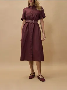 Reserved - Lniana sukienka midi z paskiem - ciemnobrązowy
