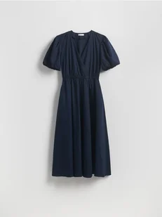 Sukienka o rozkloszowanym kroju, wykonana z tkaniny z bawełną.