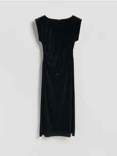 Sukienka o taliowanym fasonie, wykonana z gładkiej tkaniny.