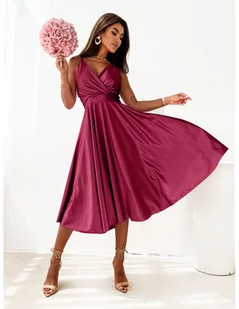 Rozkloszowana sukienka na ramiączkach CRISSY - bordowa Odkryj naszą rozkloszowaną sukienkę, która z pewnością zrobi efekt WOW na każdej imprezie! Dół z pełnego koła nadaje jej niesamowitej lekkości, a ramiączka i przekładany dekolt z zaszewkami pięknie modelują biust. Wykonana z połyskującego, satynowego materiału, który idealnie współpracuje przy każdym ruchu, ta sukienka emanuje glamour. Szeroki pas akcentujący talię dodaje elegancji i podkreśla kobiece kształty. Idealna na wesele i większe wyjścia, sprawi, że poczujesz się stylowo i pewnie. Szukasz czegoś na przyjęcie? Ta sukienka to strzał w dziesiątkę! Stylizuj ją z eleganckimi szpilkami i delikatną biżuterią, aby stworzyć niepowtarzalny look, który zachwyci wszystkich gości.