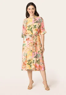 Różnokolorowa kwiatowa sukienka to kwintesencja letniego uroku i swobody. Jej długość za kolano i rękawy do łokcia sprawiają, że jest idealna na ciepłe dni. Delikatny pasek w talii podkreśla kobiecą sylwetkę, nadając lekkości całej stylizacji. Okrągły dekolt dodaje subtelności i elegancji, podkreślając szyję. Zapinana z tyłu na zamek gwarantuje idealne dopasowanie, a wzorzysta tkanina dodaje sukience wyrazistego charakteru.