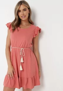Różowa Bawełniana Rozkloszowana Sukienka z Gumką w Pasie i Falbankami Ashvi