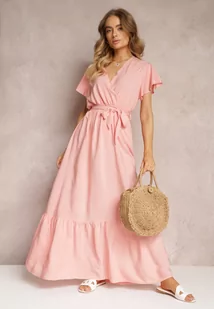 Różowa Sukienka Maxi z Gumką w Pasie i Materiałowym Paskiem Eisley