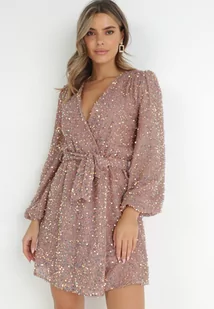 Różowa Sukienka Cekinowa z Kopertowym Dekoltem Cidoly