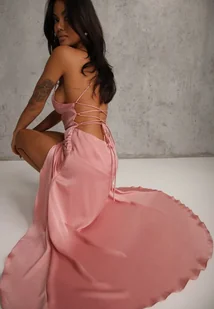 Różowa Sukienka Vices o Rozkloszowanym Kroju z Odkrytymi Plecami i Gorsetowym Wiązaniem Natiere
