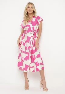 Różowo-Biała Koszulowa Sukienka w Kolorowe Łaty z Paskiem w Talii o Rozkloszowanym Kroju Folefia