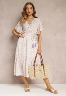 Sukienka Denila z kopertowym dekoltem i wiązaniem w talii, udekorowana falbankami i drobnym wzorem w kwiatki. Gumka w pasie po rozciągnięciu mierzy: S/M 83 cm, L/XL 90 cm, bez podszewki.