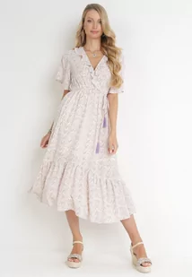 Różowo-Miętowa Sukienka z Gumką w Pasie i Kopertowym Dekoltem z Falbankami Kyphine