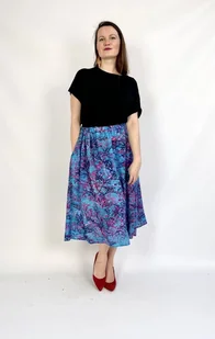 rozkloszowana SPÓDNICA midi na gumce (długość do połowy łydki) uszyta z tkaniny wiskozowej w ręcznie malowany wzór czarno-różowa RAFA KORALOWA. KOLOR zdecydo...
