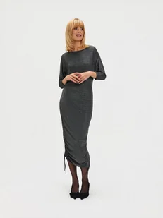 Elegancka srebrna sukienka ze ściągaczami to idealny wybór na wyjątkowe okazje. Model jest przyjemnie połyskujący dzięki metalicznym włóknom, co nadaje jej wyjątkowy charakter. Dopasowany krój i ściągacze nadają sukience dynamiczny wygląd, jednocześnie podkreślając kobiece kształty. Rękawy o długości trzy-czwarte dodają elegancji i nowoczesności. Ta srebrna sukienka to doskonały wybór na wieczorne wyjścia, wesela czy inne uroczyste spotkania, gdzie chcesz błyszczeć i przyciągać wzrok.