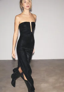 Długa aksamitna sukienka z prostym dekoltem i odkrytymi ramionami. Detal w kształcie litery U przy dekolcie. Boczne rozcięcie u dołu.