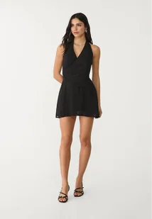 Krótka, luźna sukienka z dekoltem halter w serek i odkrytymi ramionami. Ozdobny kopertowy element z przodu z wiązaniem z boku. Niewidoczne zapięcie na suwak z boku.