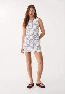 Krótka sukienka z okrągłym dekoltem z szerokimi, elastycznymi ramiączkami i odkrytymi plecami. Detal z perforowanymi haftami połączonymi na zasadzie kontrastu z wewnętrzną podszewką. Zapięcie z tyłu na kryty zamek błyskawiczny w szwie.