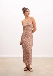 Sukienka midi wykonana z tiulu z wewnętrzną podszewką. Okrągły dekolt i cienkie, regulowane ramiączka. Marszczone detale po bokach.