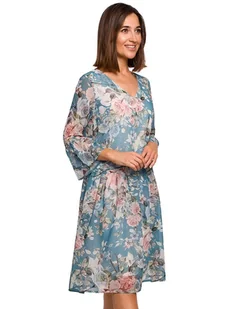 Sukienka w kolorze turkusowym ze wzorem - dekolt: V - krój rękawów: rozszerzany do dołu - krój: luźny - wzór: kwiatowy - wykończenie: delikatnie prześwitujące
