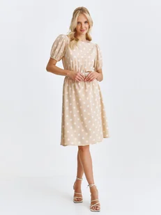 Sukienka damska Top Secret w efektowne groszki. Ceniona za swój dziewczęcy oraz pełen lekkości styl sukienka damska o luźnym kroju i długości do kolan. Posiada ona bufiaste krótkie rękawy zakończone gumką oraz okrągły dekolt i jest zapinana z tyłu na guziczek. Uroku dodaje jej praktyczna gumka w talii, podkreślająca smukłość kobiecej sylwetki oraz wykonanie z delikatnej oraz przyjemnej w dotyku dzianiny, jak i efektowny wzór w groszki na całości. Jest ona świetnym pomysłem stylizacyjnym na strój letni zarówno do pracy, jak i również podczas imprezowego wyjścia z przyjaciółmi.